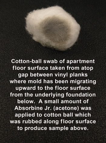 This is the result of an instant mold test taken from Apartment 17A--testing which was done live in front of the Westridge Community Manager with the same positive results as Westridge continued to deny the mold's presence. By clicking on the PDF icon above, you can see how easy it is to do this test as you are looking for a new apartment. Absorbine-Plus/Jr is best to use because Absorbine (available at Walmart and other drug stores) contains acetone (mold solvent) which picks up mold on a cotton ball relatively easily. The moisture meter in the PDF document is also a great tool to carry when looking for an apartment because it enables you to do moisture tests as you are standing inside of the unit you are considering leasing. REMEMBER THAT IF YOU DETECT ANY MOISTURE DURING YOUR MOISTURE-METER TEST, THERE IS LIKELY HIDDEN MOLD IN THE APARTMENT YOU ARE STANDING IN.