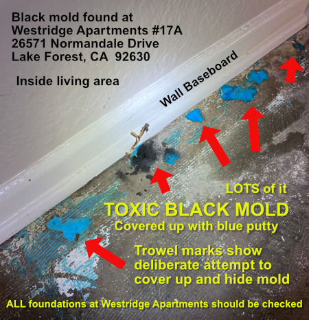 The photos herein were taken at the Westridge Apartment complex at 26571 Normandale Drive in the city of Lake Forest, California where the company has been hiding toxic mold from tenants.