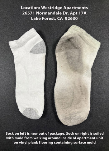 In this case, a Westridge tenant reported getting black feet from walking around the inside of the apartment, mold which was very difficult to remove, even after scrubbing. The photo shown left shows what happened when the tenant then put on a brand new pair of white socks and wore them around the apartment for just a few hours. Even after these socks were washed several times, the mold stains remained. Mold also ruined this tenant's bed comforter and other possessions because of how mold attaches itself onto bedding, clothing, towels, furniture, personal possessions, and so on (more about this below). The maintenance staff tried to claim the mold was "dirt" to keep tenants from complaining.